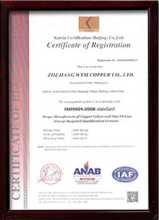 Thanks to the advanced techniques,precise machines and leading process,integrated QC systems,intensive management, WTM grows year by year. WTM hasbeen certified to ISO9001, ISO14000,CE, WRAS, ACS,DVGW, AENOR, cUPC, NSF.and AB1953 approvals for international markets;tested by "Zhejiang Quality Test Centerof Valve and Water-heating Product" as well as "National Test Center of Polymer andChemical Building Materials" for domestic markets. In order to protect the interests of theclients, WTM has been covered "Products Liability Insurance" worldwide.